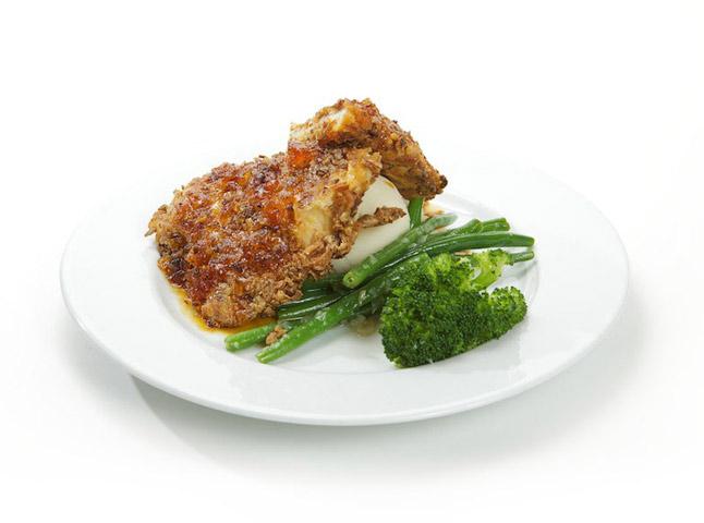 Boneless chicken breast with crispy onions, sweet citrus sauce. Mashed potato & fresh vegetables.