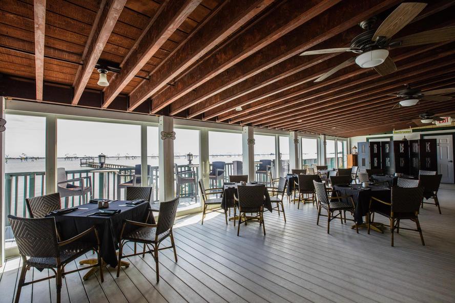 Our air-conditioned covered porches offer an expansive outdoor riverfront dining experience while retaining the comfort and service of the indoor rooms. The upper dog deck seats 40 with a full service 'dog bar.'